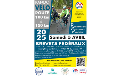 Comme chaque année, nos amis des Randonneurs Autonomes Aquitains organisent leur traditionnel Brevet Fédéraux 100 et 150 km de début de saison, avec le repas froid toujours servi à la salle des fêtes de St Yzan-de-Soudiac. Certains de nos adhérents s...